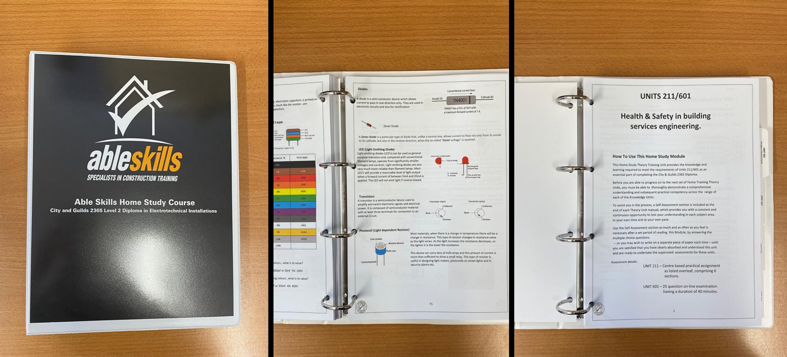 This training method is unique to our centre, in the past we recommended this option to those with an existing job looking to re-train or those with kids and so on. However, this option is now perfect for anybody looking to learn the trade of electrics during this upcoming lockdown period from the comfort of your own home! Obviously you will not be tasked with learning everything by yourself, instead this course breaks up each qualification into two parts; theory and practical. We will send you a 'Home-Study pack' which will include all of the theory, it has been specially designed to gradually introduce you to electrical theory, learning the definitions, formulas, processes and much more. With the pack you will also have access to the online learning platform 'Smartscreen' as a second source of information. There will also be test questions within the pack so that you can test you knowledge as you study - Ideally, we would prefer that you spend at least 6-weeks reviewing the 'Home-Study electrician pack' before you consider attending for your first block of practical training. Below is an example of the pack you would receive taking on our Home Study Electrics Level 2 course...