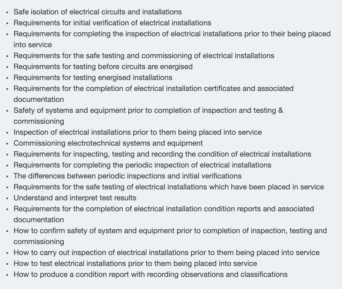 Our Level 3 Award in Inspection and Testing Course is completely theory based and will prepare you for both written and online exams that will be taken here at our centre. In addition, candidates will; also need to successfully complete a 2.5 hour practical assignment; comprising of a full Initial verification and a Periodic inspection (combined within the same assessment) of a three-phase electrical installation, including completion of all appropriate documentation.
