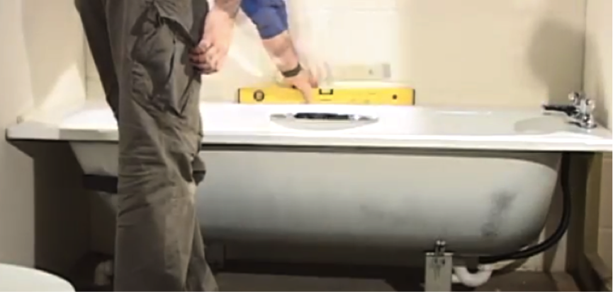 The bath is now ready to go in place. It must be level in both planes. To achieve this, pick one leg and use this as a dating point. Level this leg with its opposite, then level these two with the remaining legs. By tightening or loosening the threads on the bath’s feet you can make the necessary adjustments. Adjust until the bath is level.