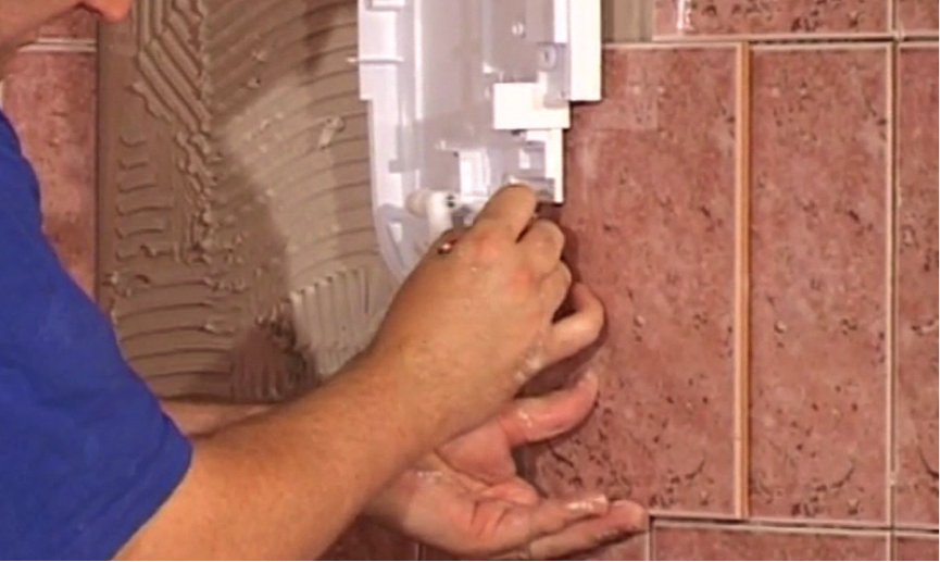 Apply adhesive to the back of the tile and slide it in behind the shower unit. Then repeat the process for the other tiles around the unit until the entire shower area is tiled.