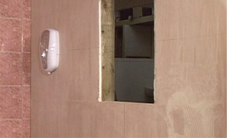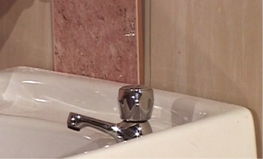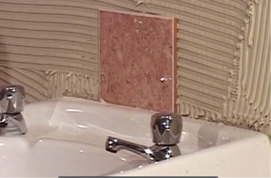 The tile to the left of the centre tile may by obstructed by the screw that holds the sink to the wall. You will need to cut out a corner of the tile in order for this to fit. Mark on the tile in pencil a point on the tile above where the screw would be located, both vertically and horizontally. Remove the tile and clean off the adhesive on the back using water.