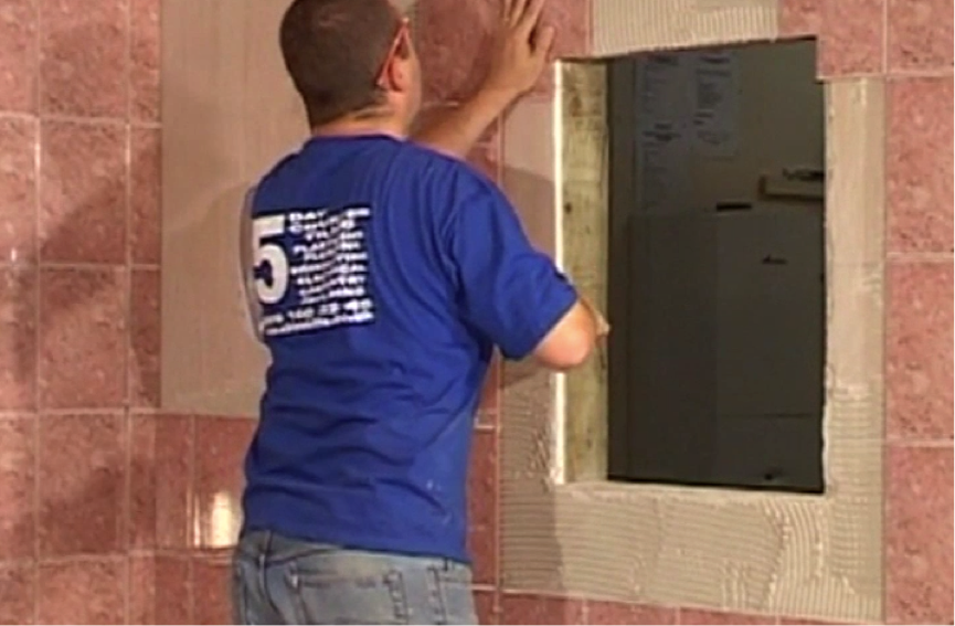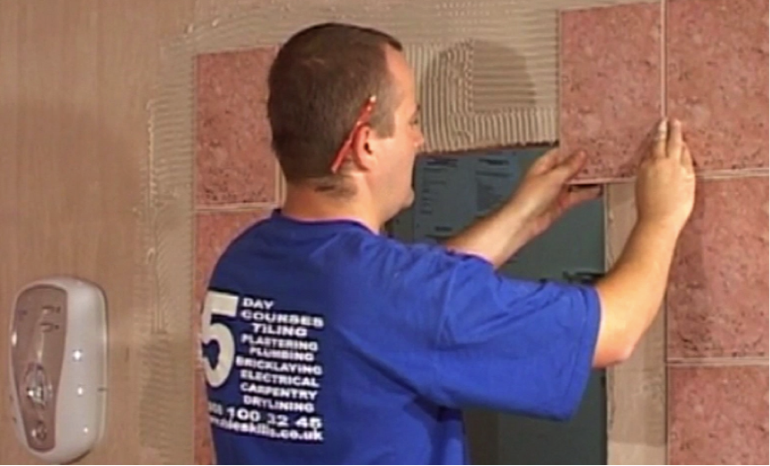 - Remember, if it is going up against a wall already tiled, like pictured, you don’t leave room for a spacer on the wall side, for a flush finish